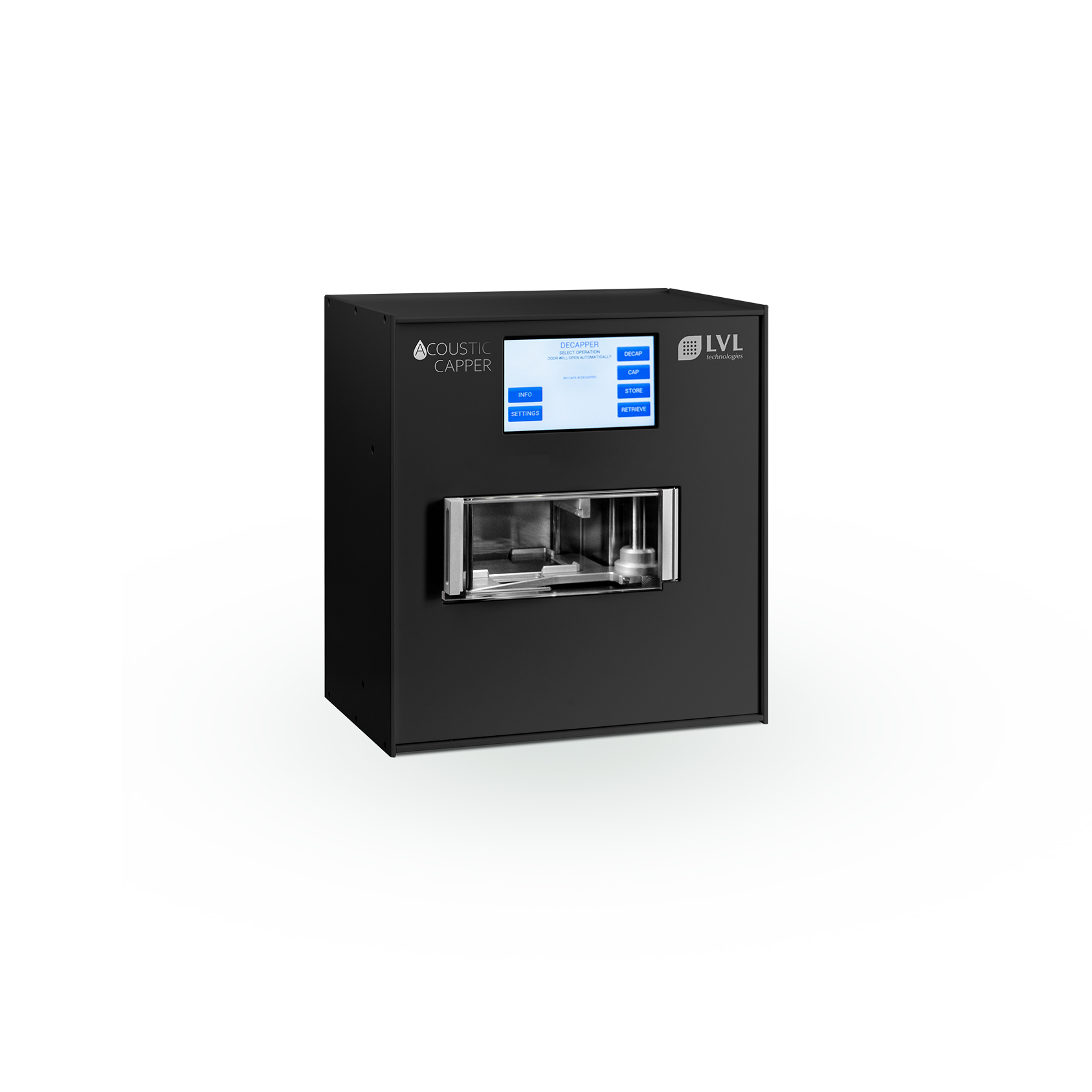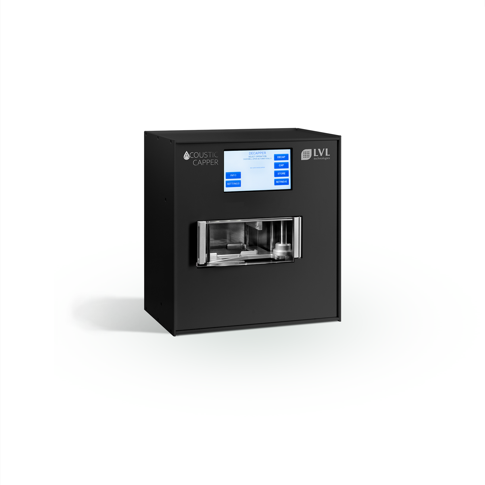 Der SAFE® Acoustic Capper von LVL technologies bietet eine vollautomatisierte Lösung für das gleichzeitige Verschließen und Öffnen von bis zu 96 Röhrchenverschlüssen. Dieses Gerät ist ideal für Labore, die eine schnelle und zuverlässige Verarbeitung von Verschlüssen benötigen.