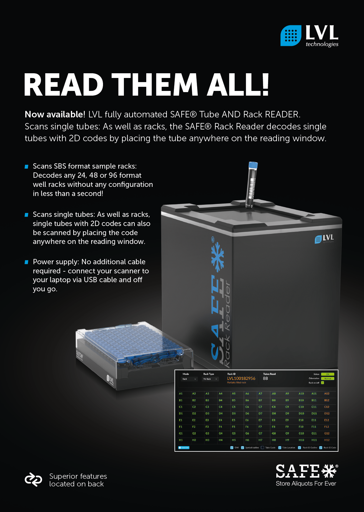 Plug and Play – verbinden Sie Ihren LVL SAFE Reader mit Ihrem Laptop oder PC und scannen Sie Ihrer Racks oder einzelne Tubes