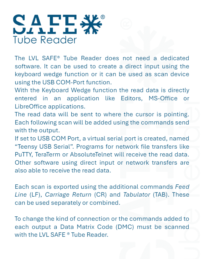 Der SAFE® Single Tube Reader von LVL technologies ist die perfekte Lösung für das präzise Scannen einzelner 2D-codierter Röhrchen. Dieses benutzerfreundliche Gerät ermöglicht schnelle und genaue Scans von 2D-Codes sowie QR-Codes und bietet flexible Datenexportoptionen in MS Excel, Text- oder Bilddateien. Optional kann der Reader mit einem Linearen Barcode Scanner ausgestattet werden, um gleichzeitig 1D-Barcodes zu erfassen. Mit einer kryoschützenden Ausführung wird die Eintrübung bei gekühlten Proben vermieden. Die klare visuelle Rückmeldung des SAFE® Single Channel Readers zeigt an, ob Röhrchen korrekt gescannt wurden, was die Probenverwaltung vereinfacht und Fehler minimiert.